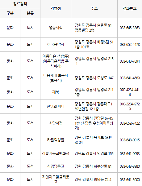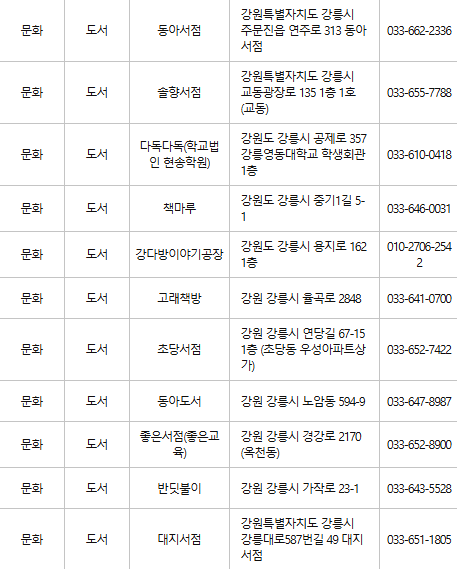 강릉에서는 다양한 서점이 문화누리카드 가맹점으로 등록되어 있습니다. 예를 들어, 교보문고 및 지역 서점에서 책을 구매하거나 학용품을 구입할 수 있습니다.