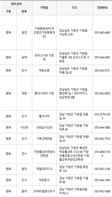거창에서는 다양한 서점이 문화누리카드 가맹점으로 등록되어 있습니다. 예를 들어, 교보문고 및 지역 서점에서 책을 구매하거나 학용품을 구입할 수 있습니다.