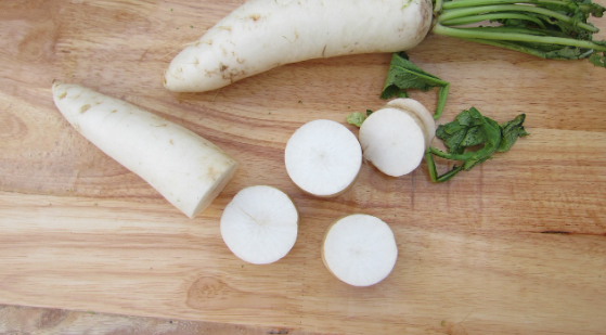 - 무의 껍질을 깨끗하게 벗겨냅니다.