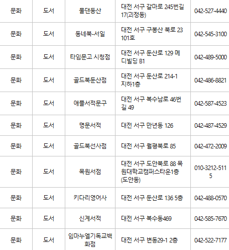 대전 서구에서는 다양한 서점이 문화누리카드 가맹점으로 등록되어 있습니다. 예를 들어, 교보문고 및 지역 서점에서 책을 구매하거나 학용품을 구입할 수 있습니다.