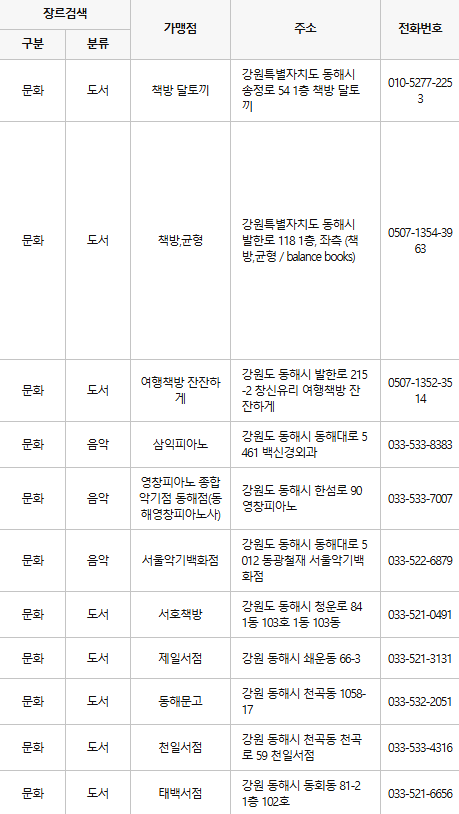 동해에서는 다양한 서점이 문화누리카드 가맹점으로 등록되어 있습니다. 예를 들어, 교보문고 및 지역 서점에서 책을 구매하거나 학용품을 구입할 수 있습니다.