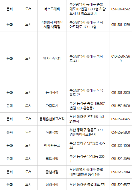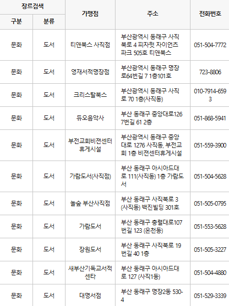 부산 동래구에서는 다양한 서점이 문화누리카드 가맹점으로 등록되어 있습니다. 예를 들어, 교보문고 및 지역 서점에서 책을 구매하거나 학용품을 구입할 수 있습니다.