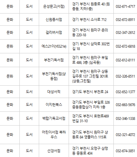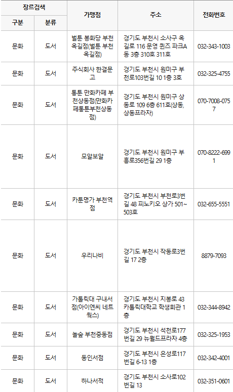 부천에서는 다양한 서점이 문화누리카드 가맹점으로 등록되어 있습니다. 예를 들어, 교보문고 및 지역 서점에서 책을 구매하거나 학용품을 구입할 수 있습니다.