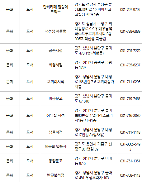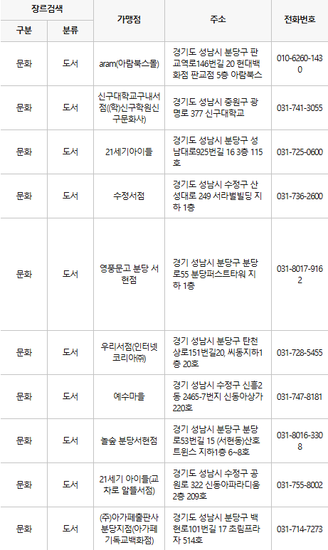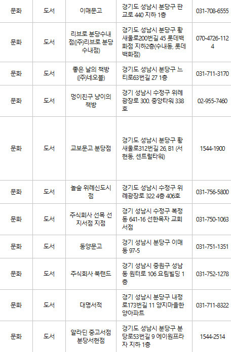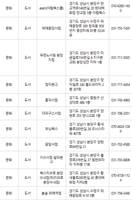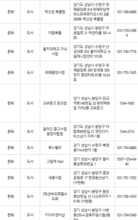성남에서는 다양한 서점이 문화누리카드 가맹점으로 등록되어 있습니다. 예를 들어, 교보문고 및 지역 서점에서 책을 구매하거나 학용품을 구입할 수 있습니다.
