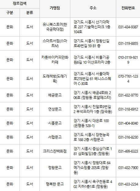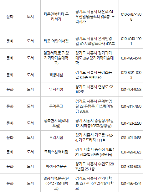 시흥에서는 다양한 서점이 문화누리카드 가맹점으로 등록되어 있습니다. 예를 들어, 교보문고 및 지역 서점에서 책을 구매하거나 학용품을 구입할 수 있습니다.