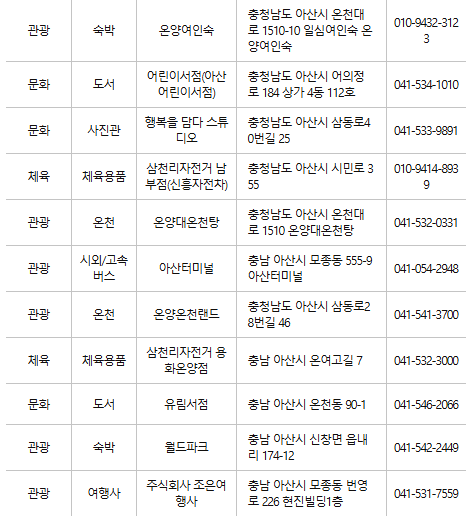 아산 인근의 숙박업소 및 관광지에서도 카드를 사용할 수 있어 여행을 즐기기에도 유용합니다.