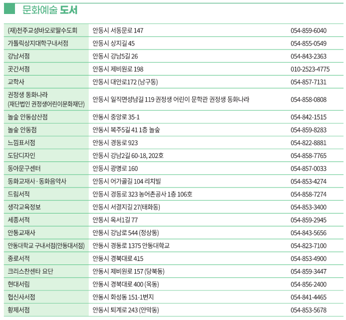 안동 에서는 다양한 서점이 문화누리카드 가맹점으로 등록되어 있습니다. 예를 들어, 교보문고 및 지역 서점에서 책을 구매하거나 학용품을 구입할 수 있습니다.