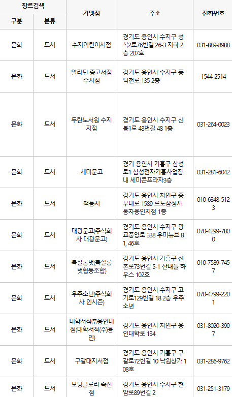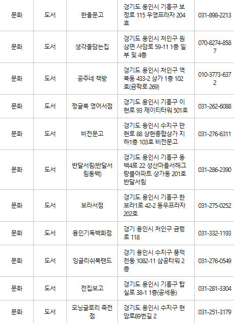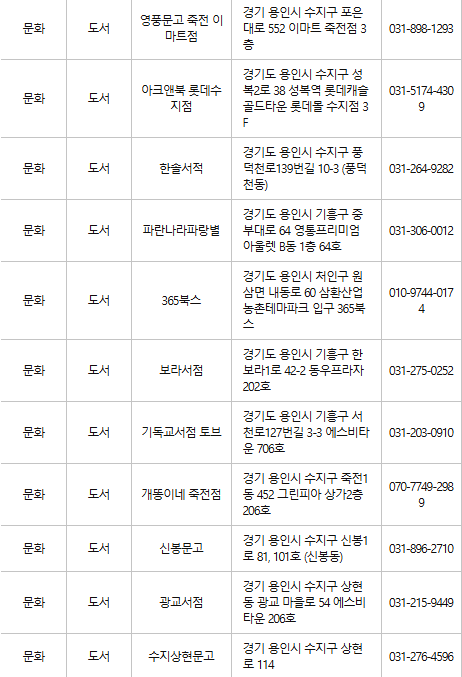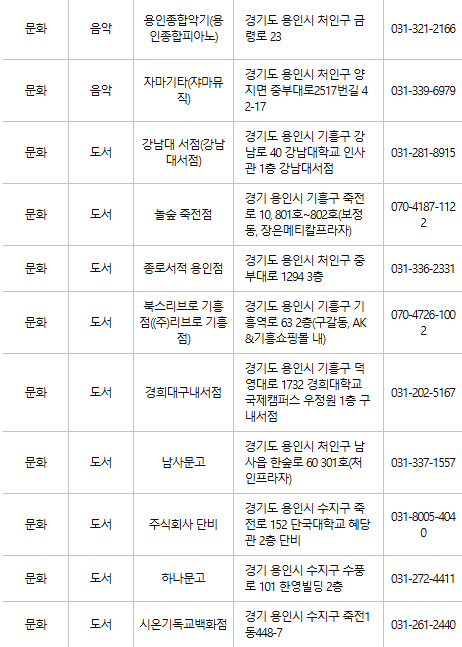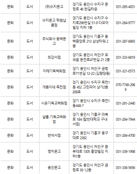 용인에서는 다양한 서점이 문화누리카드 가맹점으로 등록되어 있습니다. 예를 들어, 교보문고 및 지역 서점에서 책을 구매하거나 학용품을 구입할 수 있습니다.