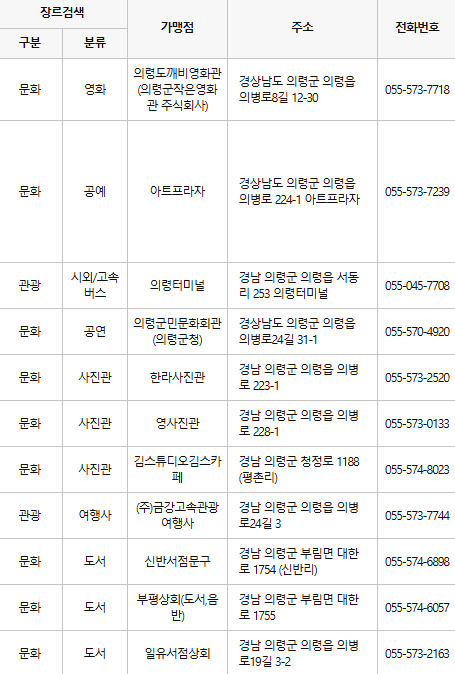 의령 문화누리카드 사용처