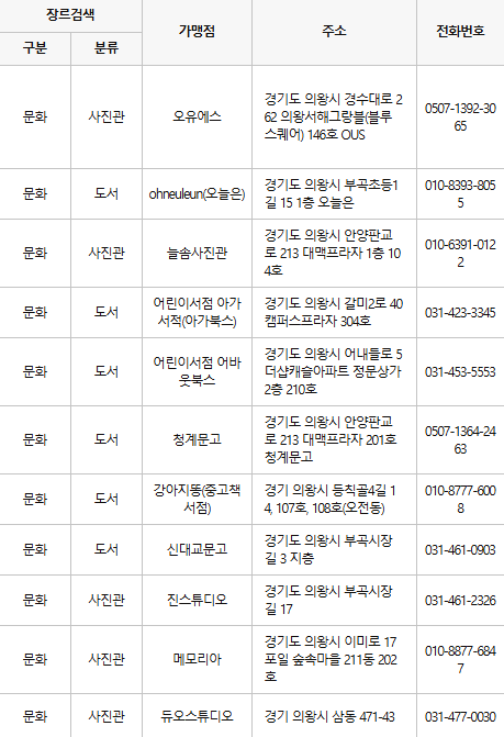의왕에서는 다양한 서점이 문화누리카드 가맹점으로 등록되어 있습니다. 예를 들어, 교보문고 및 지역 서점에서 책을 구매하거나 학용품을 구입할 수 있습니다.