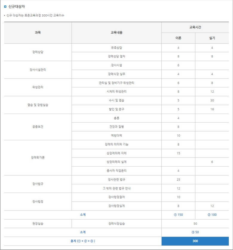 ※ 이론 강의 및 실기연습의 평가는 이론 강의 및 실기연습의 교육을 마친 후 장례지도사 교육기관이 실시 전공자 교육과정의 경우는 이론강의·실기연습 및 현장실습을 각각 100분의 90 이상 출석한 경우에만 수료인정받을 수 있습니다.