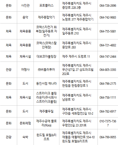 제주시는 문화누리카드 가맹점이 풍부한 도시 중 하나입니다. 다양한 분야에서 카드를 사용할 수 있어 문화생활을 즐기기에 적합합니다. 문화누리카드로 이용 가능한 주요 가맹점은 다음과 같습니다.