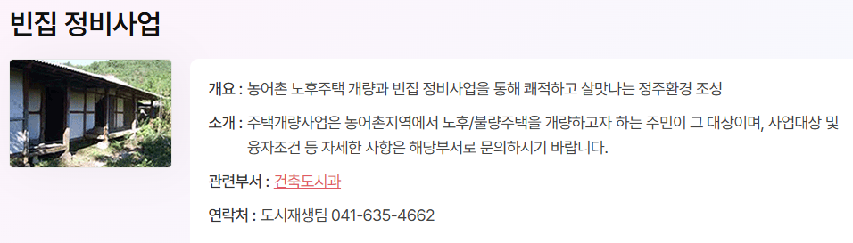 - 빈집 정보 확인 : 충남도청 홈페이지 등에서 원하는 지역 및 조건에 맞는 빈집 검색