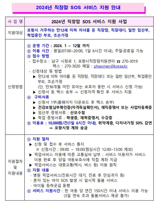 - 접수 장소 : 포항시직장맘지원센터 (남구 시청로 1) 전화상담 후 신청
