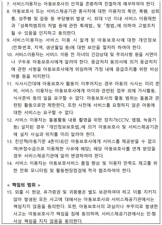 – 서비스 이용 시 소요되는 실교통비 : 이용자가 아동보호사에 직접 지급