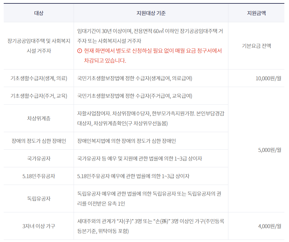 ✅장기공공임대주택 및 사회복지시설 거주자 : 기본요금 전액
