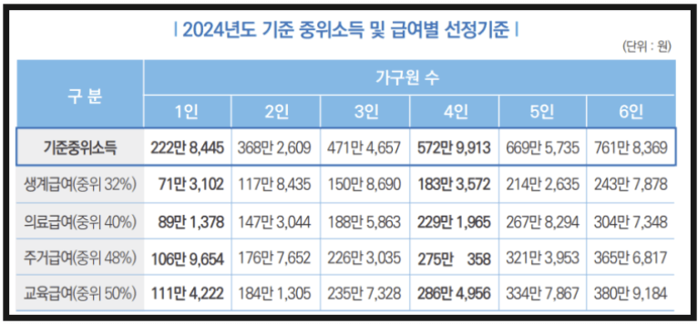 2024년 기준 중위소득을 살펴보면 아래와 같습니다.